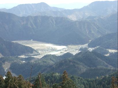 | (西方向の眺望) 洞戸事務所交差点付近から柳島のほ場方面がよく見えます。右手の高所は「三等三角点 天神」でしょうか、ばっちり望めます。しかし樹木が多そうで向こうからこちらが見えるかなぁ? |